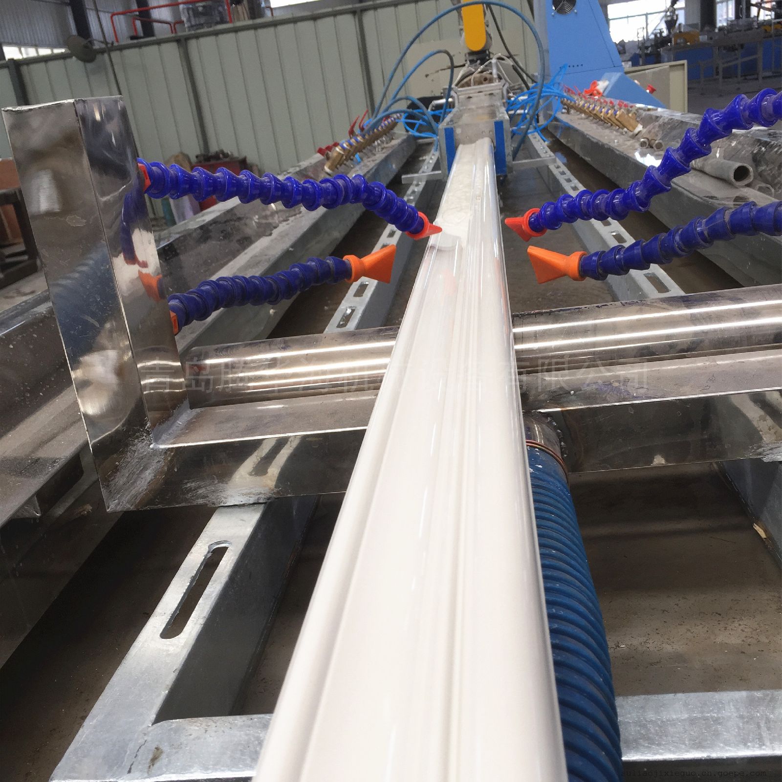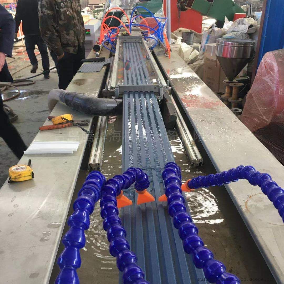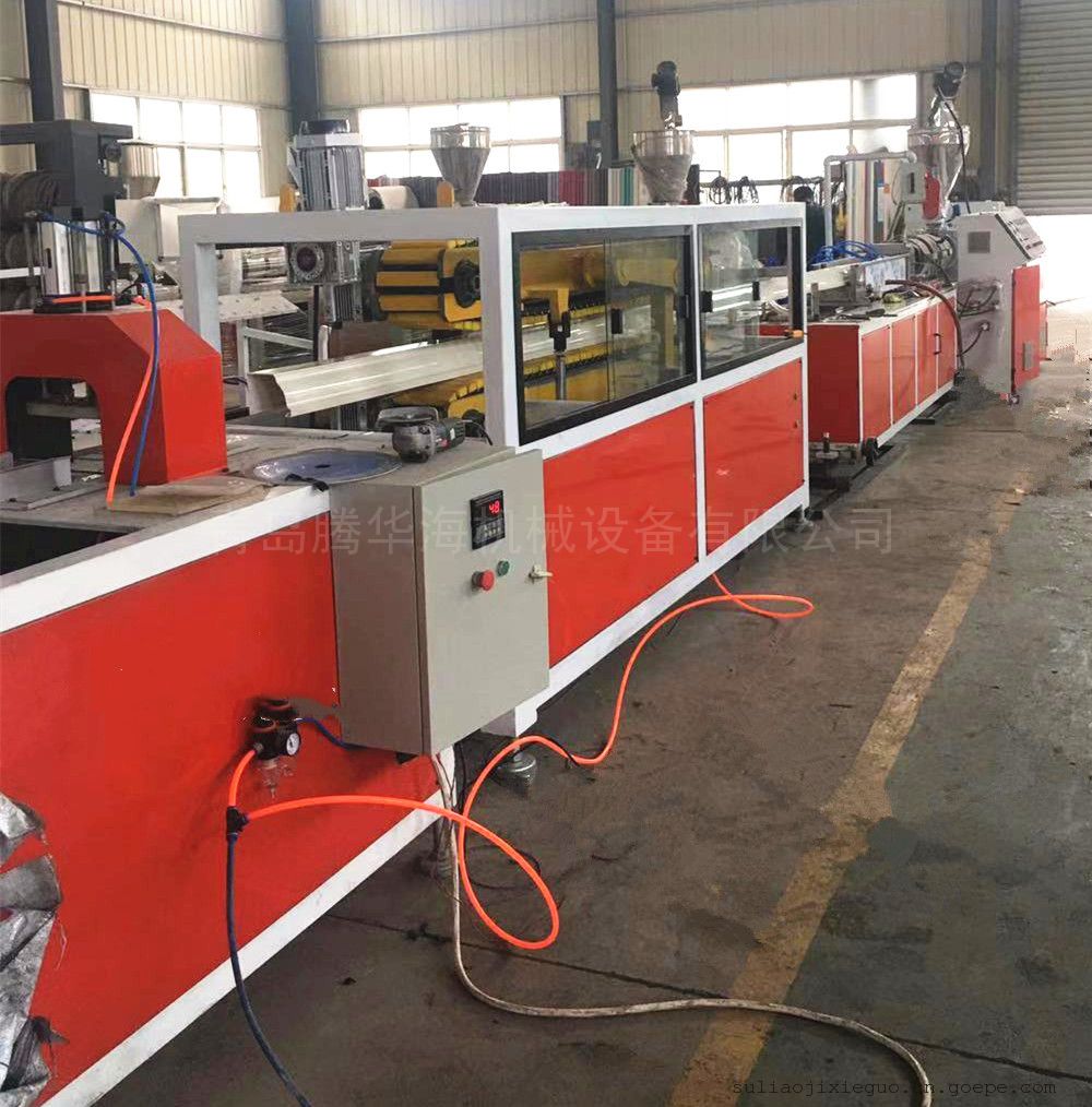 青岛塑料挤出机械有限公司生产的PP、PE、PVC木塑宽幅门板生产线设备采用专门设计的锥形双螺杆挤出机,直流调速拖动,进口品牌的温控仪表,具有调速范围广,温控精度高,操作方便等优点。辅机由真空定型台、牵引机、切割机及堆料机组成。配备大型强制冷却装置确保板材定型效果。履带式牵引机采用精密减速电机及变频器,具有结构合理、牵引力大、牵引稳定等优点。切割机具有工作可靠准确,切割精度高的优点,推料架附有自动推料卸料装置,具有不伤料适用简便等优点。辅机机组采用可编程PLC控制或国产品牌的温控仪表控制系统,可靠稳定。