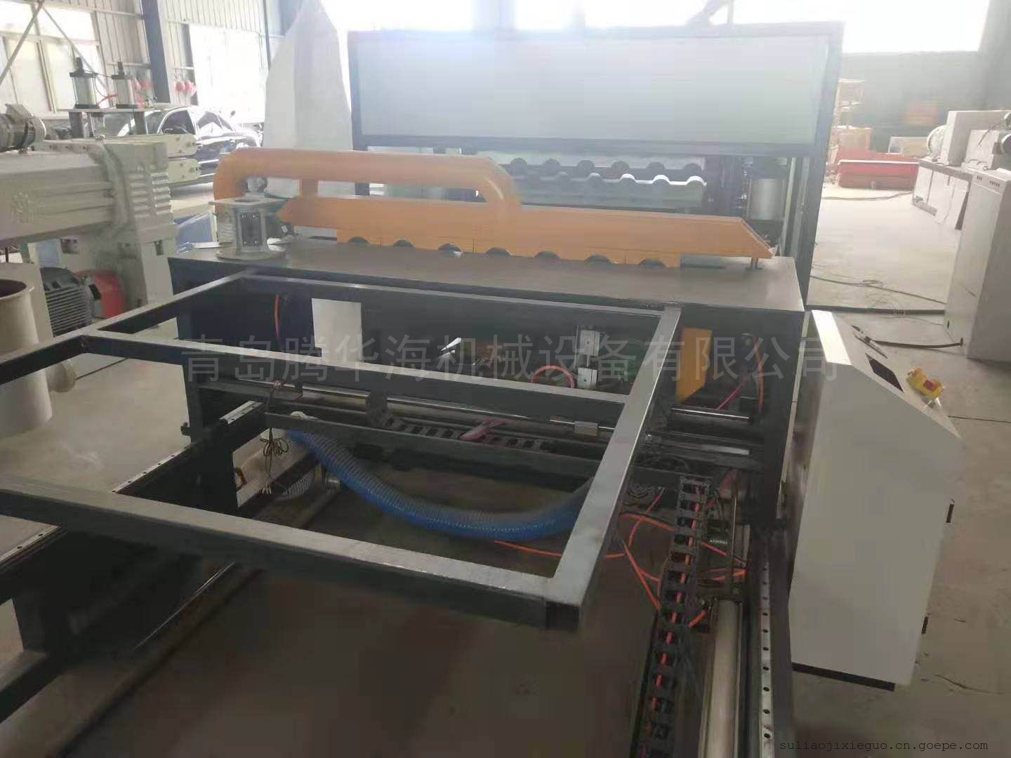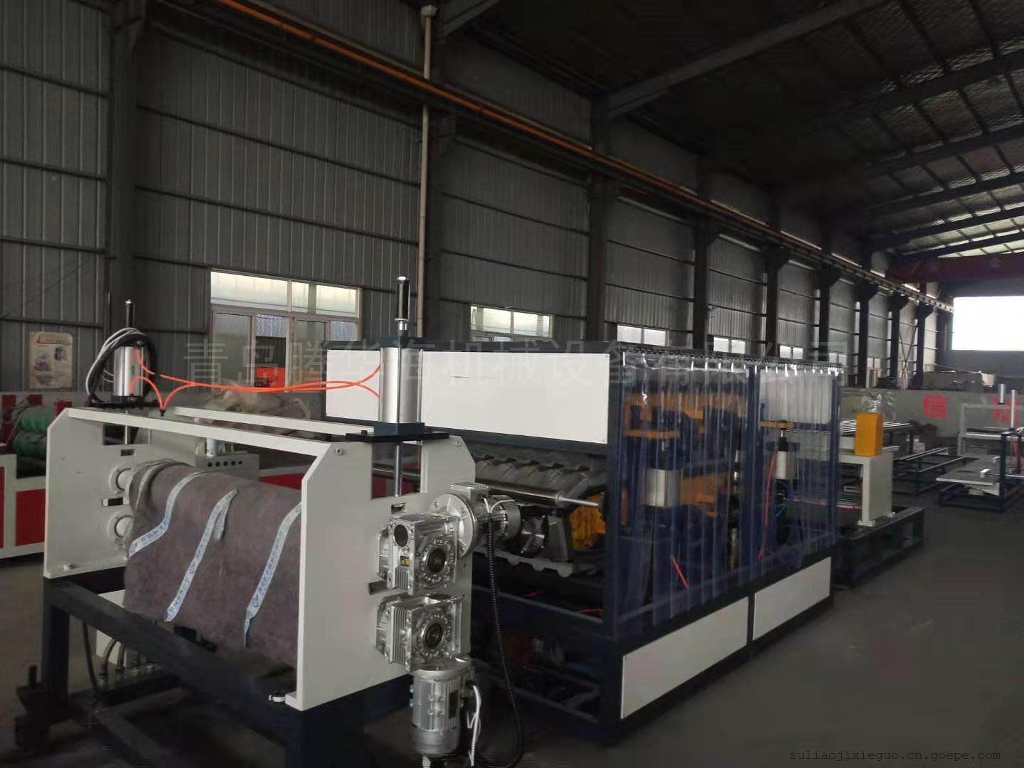 PVC波浪瓦设备包括PVC塑料波浪板设备、PC塑料梯形板设备,以sj90单螺挤出机与相应的波浪板成型机、牵引辅机及切割机配套使用,可连续生产建筑用PC彩色耐侯阻燃型塑料波浪板。若更换有关部件亦可生产塑料平板、格子板等,该机具有塑化好、性能稳定、结构紧凑、自动化程度高、便于操作等特点,是建筑生产厂家理想的生产设备。PVC波浪瓦设备主要技术参数:主机型号sjsz-65 x 132机头形式衣架式平板机头l=1000mm成型装置大波r=15 h=16.5峰距=63mm小波r=9 h=8峰距=36mm成型辊长度1000mm电机功率1.5kw(变频调速)冷却模具尺寸1000mm x 540mm冷却方式水冷牵引速度0.5–5m/min牵引功率2.2kw(变频调速)切割方式剪切式(油压)切割随动距离500mm气路工作压力0.4–0.6 mpa。